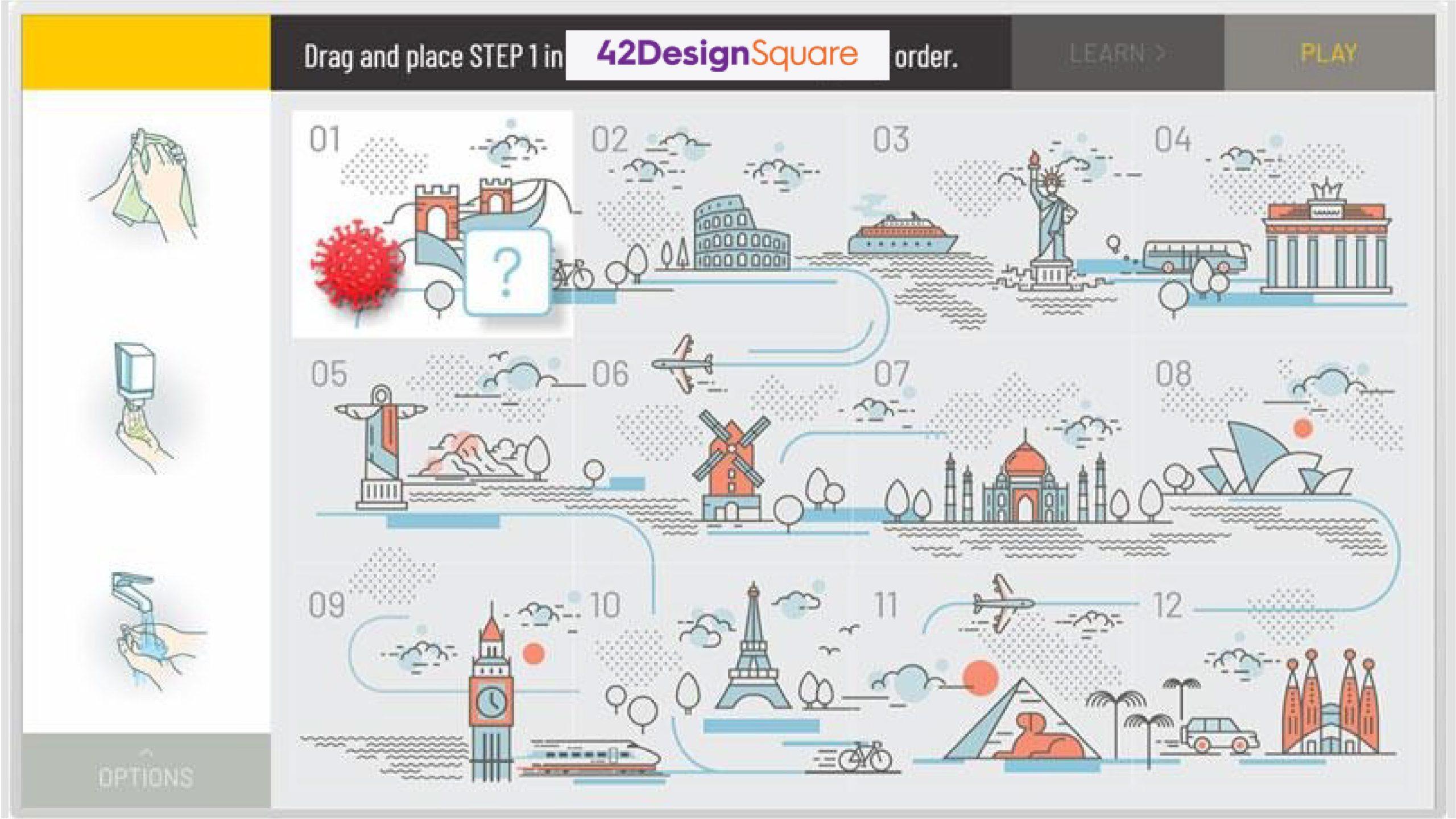Add to all this, the instructional designer’s dilemma: how do I assess the understanding of the handwash step sequence? How do I ensure that the learner can get it right each time? How do I reinforce the behavior and encourage a habit?